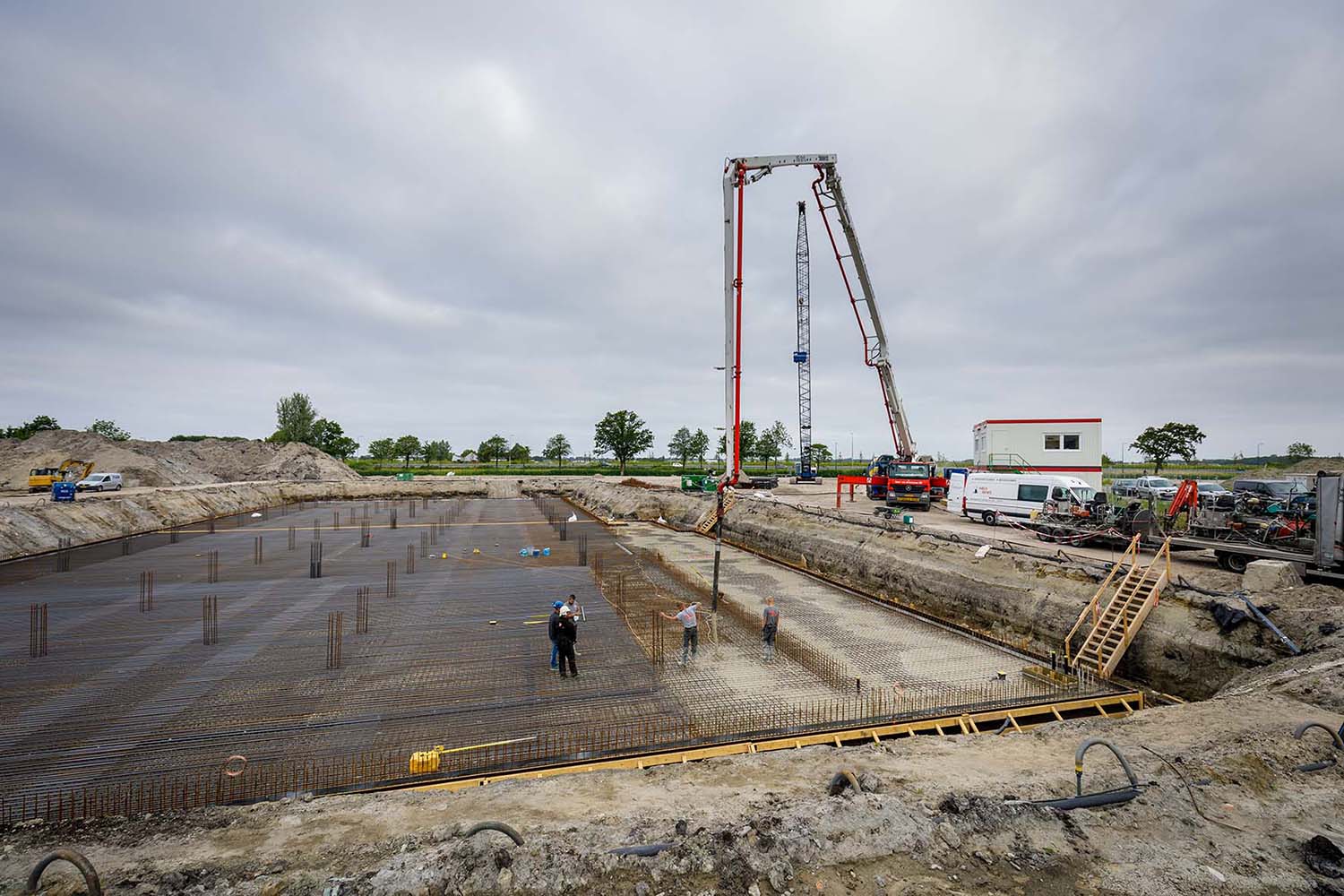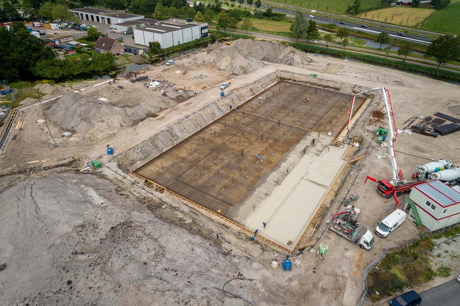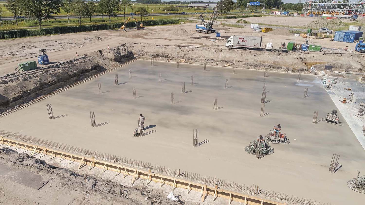 We hebben voor opdrachtgever Tacx de fundering en parkeerkelder gerealiseerd van een nieuw pand op het Industrieterrein De Boeg, naast de A44. Een indrukwekkend betonproject met een vloeroppervlakte van 3.100 m2 en een vloerdikte van 50 cm. Er was 1.550 m3 beton nodig voor de vloer. Gezien deze enorme hoeveelheid is het storten opgesplitst in twee fase